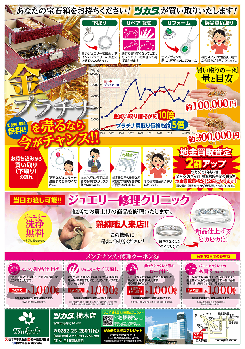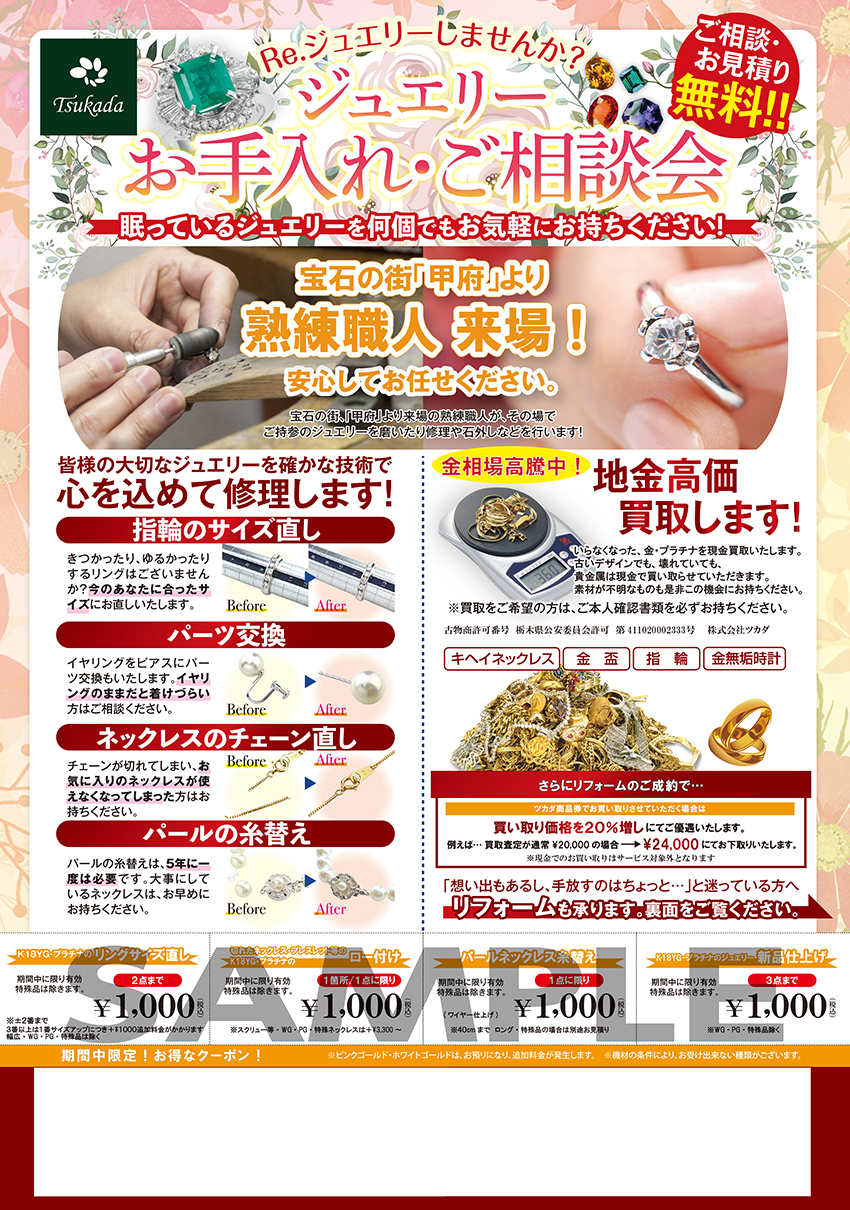 ツカダではジュエリーのお手頃なリフォームから今価格高騰中の金・プラチナのお得な買取りを企画しております。
